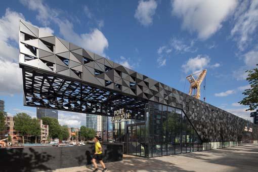 MoederscheimMoonenArchitects 在鹿特丹歷史悠久的老港口區(qū)(Maritime District)設(shè)計(jì)了新的港口展館。建筑師們設(shè)計(jì)了一座新的緊湊型建筑,取代了曾經(jīng)位于其位置的三個(gè)過時(shí)的展館。展館增加了透明度和可見性,以便可以清楚地看到歷史悠久的港口和建筑物中發(fā)生的活動(dòng)。在新館內(nèi),多種功能匯聚一堂。展館內(nèi)設(shè)有鹿特丹港的港口參觀中心,游客可以在此了解這座城市令人印象深刻的海港。參觀者還會發(fā)現(xiàn)海事博物館(MaritimeMuseum)的工作坊。在這里,焊工、鐵匠和木匠在博物館港口維護(hù)歷史悠久的船隊(duì)。這些工作室向公眾開放,所有的室內(nèi)功能都是相連的,將歷史和現(xiàn)在的海港結(jié)合在一起。參觀者可以直接穿過港口參觀中心進(jìn)入海事博物館的車間! 此外,建筑物兩端有餐廳,咖啡廳的空間。